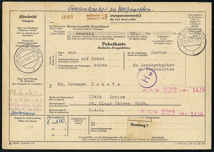 7544 | 18 € | 4330 Mülheim / Ruhr : Mülheim/ (Ruhr) 1 -a- 1958 (21.11.) seltener, lila Registrierkassen-Paket-Freistempel 14.15 (DM), Typ "Anker" + 2K-Steg: (22a ) MÜLHEIM (RUHR) 1/t + brauner Paketzettel, klar gest. Übersee-Paketkt. n. USA!, seltene Portostufe! (Dü.H-1B) | ![]() | |