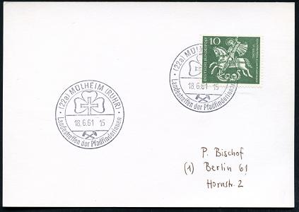 7548 | 12 € | 4330 Mülheim / Ruhr : (22a) MÜLHEIM (RUHR)/ Landestreffen der Pfadfinderinnen 1961 (18.6.) SSt (Scout-Logo) auf passender EF 10 Pf. St. Georg (Mi.346 EF) Inl.-Karte (Bo.9 , nur am 18.6.) | ![]() | |