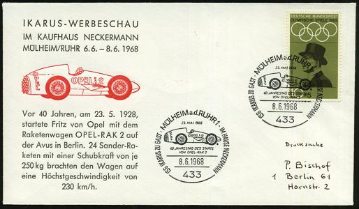 7549 | 12 € | 4330 Mülheim / Ruhr : 433 MÜLHEIM a.d.RUHR 1/ ..40.JAHRESTAG DES STARTS/ VON OPEL-RAK 2.. 1968 (8.6.) SSt = Opel-Raketen-Rennauto (AVUS-Versuchswagen) auf Olympia-Frankatur, motivgl. Sonderumschlag (Bo.14) | ![]() | |