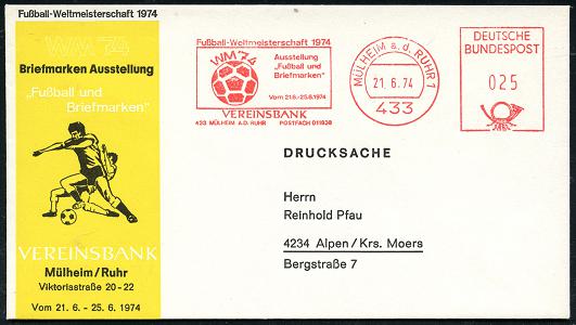 7551 | 12 € | 4330 Mülheim / Ruhr : 433 MÜLHEIM a.d.RUHR 1/ Fußball-Weltmeisterschaft 1974/ WM´74/ Ausstellung../ VEREINSBANK 1974 (21.6.) AFS Postalia (Fußball) auf Ausstellungs-Sonderumschlag (Dü.E-26 Po) | ![]() | |