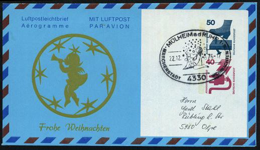 7552 | 12 € | 4330 Mülheim / Ruhr : 4330 MÜLHEIM a d RUHR 1/ MÄRCHENSTADT WEIHNACHTEN 1976 (22.12.) SSt = Sternthaler auf Privat-Aerogramm: Frohe Weihnachten (Engel mit Fanfare) klar gest. (Mi.PF 11) | ![]() | |