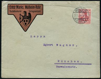7514 | 18 € | 4330 Mülheim / Ruhr : MÜLHEIM/ * (RUHR) 1/ b 1909 (27.5.) 1K-Gitter auf farbigem Firmen-Bf.: Ernst Marks.. Buchdruckerei Verlagsanstalt (Adler mit Drucktampons u. Wappen) dekorativer Fern-Bf. (Mi.86 EF) | ![]() | |