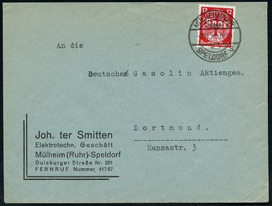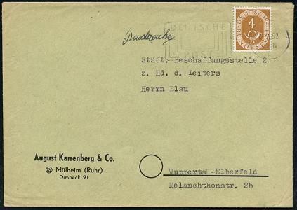 7536 | 28 € | 4330 Mülheim / Ruhr : (22) MÜLHEIM (RUHR)/ b/ DEUTSCHE/ POST 1952 (12.4.) Postfreistempel "Linienrechteck" ohne Wertziffer als Entwertung auf EF 4 Pf. Posthorn , Firmen-Bf.: August Karrenberg & Co... (Dü.D-10, schwarz ohne Wertziffer = Spätverwendung !) | ![]() | |