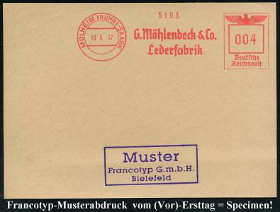 7520 | 35 € | 4330 Mülheim / Ruhr : MÜLHEIM (RUHR)-SAARN/ G.Möhlenbeck & Co./ Lederfabrik 1937 (10.5.) AFS-Musterabdruck Francotyp "Reichsadler" , glasklar gest. Francotyp-Musterblatt vom (Vor)-Ersttag !, selten! (Dü.E-5CGh) | ![]() ![]() | |