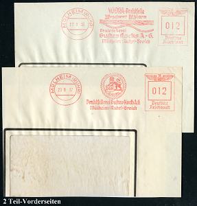 7521 | 25 € | 4330 Mülheim / Ruhr : MÜLHEIM (RUHR)/ Drahtseilerei Gustav Kocks AG.. 1937/39 2 verschiedene AFS Francotyp "Reichsadler" (Logo mit Drahtseil etc.) je auf Teil-Vorderseite, 2 Belege (Dü.E-5CGo) | ![]() | |