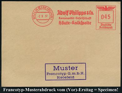 7522 | 35 € | 4330 Mülheim / Ruhr : MÜLHEIM (RUHR)/ Adolf Philipps & Co./ KG/ Häute-Kalkspalte 1937 (2.9.) AFS-Musterabdruck Francotyp "Reichsadler" , glasklar gest. Francotyp-Musterblatt vom (Vor)-Ersttag !, selten! (Dü.E-5CGo) | ![]() ![]() | |