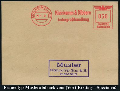 7524 | 35 € | 4330 Mülheim / Ruhr : MÜLHEIM (RUHR)/ Kleinkemm & Dibbern/ Ledergroßhandlung 1938 (28.1.) AFS-Musterabdruck Francotyp "Reichsadler" , glasklar gest. Francotyp-Musterblatt vom (Vor)-Ersttag !, selten! (Dü.E-5CGo) | ![]() ![]() | |
