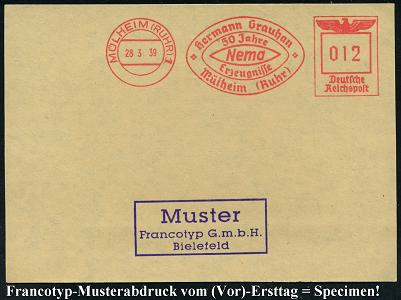 7526 | 35 € | 4330 Mülheim / Ruhr : MÜLHEIM (RUHR) 1/ Hermann Grauhan/ 50 Jahre/ Nema/ Erzeugnisse.. 1939 (28.3.) AFS-Musterabdruck Francotyp "Reichsadler" , glasklar gest.Francotyp-Musterblatt vom (Vor)-Ersttag !, selten! NaMa = Netzschkauer Maschinenfabrik (Dü.E-5CGo) | ![]() ![]() | |