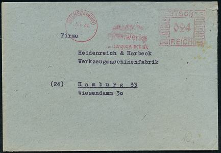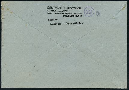 7531 | 25 € | 4330 Mülheim / Ruhr : MÜLHEIM (RUHR)/ Deutsche/ Eisenwerke/ AG 1946 (3.6.) AFS Francotyp "Mäanderrechteck" unverändert weiterverwendet mit Inschrift "DEUTSCHES REICH" = Notmaßnahme! (Abs.-Klischee abgenutzt) rs. Abs.-Vordruck: DEUTSCHE EISENWERKE AG, WERK FRIEDRICH WILHELM-HÜTTE.. (kl. Eckrißchen geschl.) Fern-Bf. n. Hamburg (Dü.E-2BAo, unverändert weiterverwendet) | ![]() ![]() | |