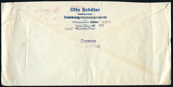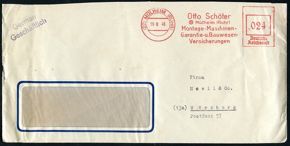 7532 | 25 € | 4330 Mülheim / Ruhr : (22) MÜLHEIM (RUHR)/ Otto Schöter../ Montage-Maschinen-/ Garantie-u.Bauwesen-/ Versicherungen 1946 (19.8.) aptierter AFS Francotyp "Reichsadler" = entfernt = Notmaßnahme! , rs. geänderter Abs.-Vordruck (vormals Duisburg) Fern-Bf. n. Würzburg (Dü.E-13 J-127o) | ![]() ![]() | |