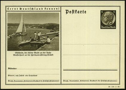 7523 | 10 € | 4330 Mülheim / Ruhr : Mülheim..Ruhr 1938 6 Pf. BiP Hindenbg., braun: Wassersport an der Hermann-Göring-Brücke = 2 Zweier-Kajaks, 1x mit Hilfssegeln, ungebr. (Mi.P 236/38-116-B 1) | ![]() | |