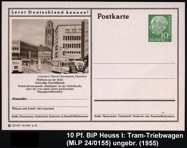 7540 | 8 € | 4330 Mülheim / Ruhr : Mülheim a.d.Ruhr 1955 10 Pf. BiP Heuss I, grün: .."Stadtmitte" an der Schloßstraße.. (Omnibus, Tram etc.) ungebr. (Mi.P 24/155) | ![]() | |