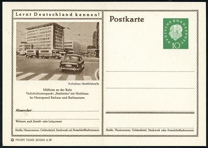 7546 | 6 € | 4330 Mülheim / Ruhr : Mühlheim a.d.Ruhr 1959 10 Pf. BiP Heuss III, grün: .."Stadtmitte" mit Hochhaus.. Rathaus (u. Mercedes-PKW, LKW etc.) ungebr. (Mi.P 41/76-453) | ![]() | |