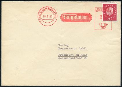 7547 | 18 € | 4330 Mülheim / Ruhr : (22a) MÜLHEIM (RUHR) 1/ Tengelmann 1960 (28.9.) AFS Francotyp 000 Pf. als Vorausentwertung auf 20 Pf. Heuss III , klar gest. Antwort-Bf. (daher Mittelfalte) n. Ffm., seltene Verwendung! (Dü.E-23CO) | ![]() | |