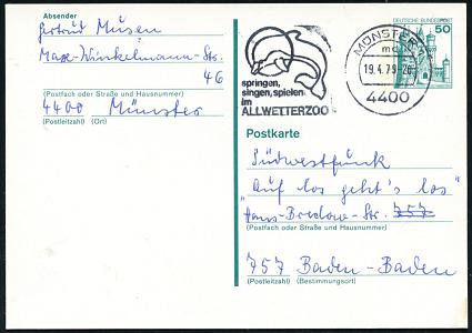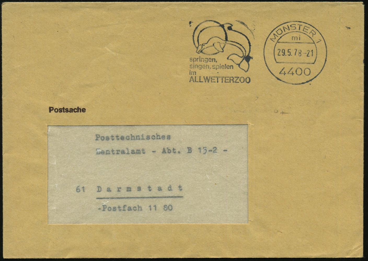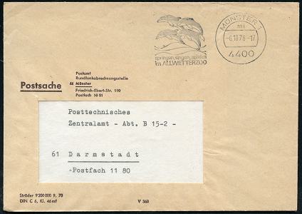 7638 | 12 € | 4400 Münster Maschinen- u. Serienstempel : 4400 MÜNSTER 1/ mi/ springen,singen,spielen/ im Allwetterzoo 1976 (6.10.) MWSt = 4 springende Delphine klar auf Ortsdruck-Postdienst-Bf.: Rundfunksabrechnungsstelle, 44 Münster.. (Bo.130 A III , nur 1976 und 1979 verwendet!) | ![]() | |