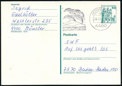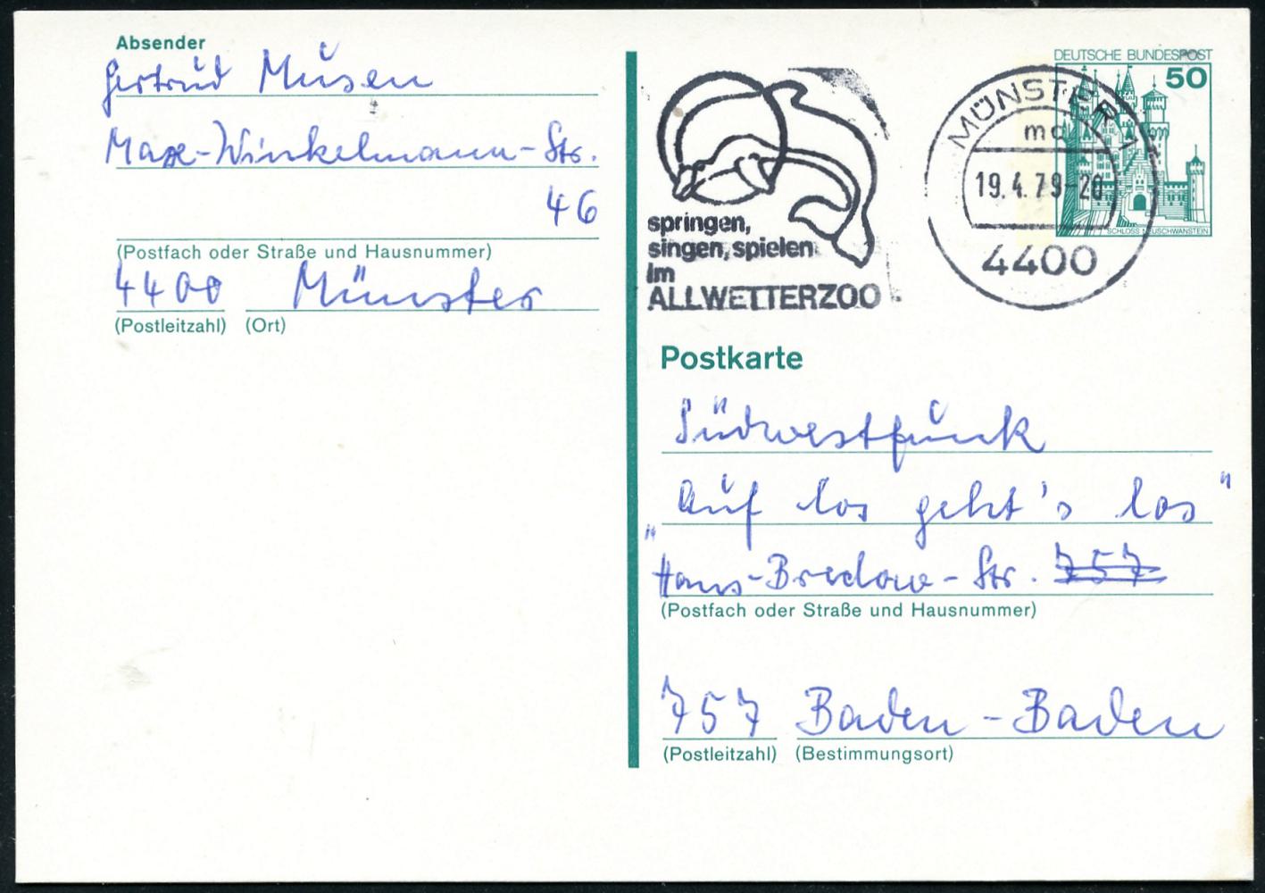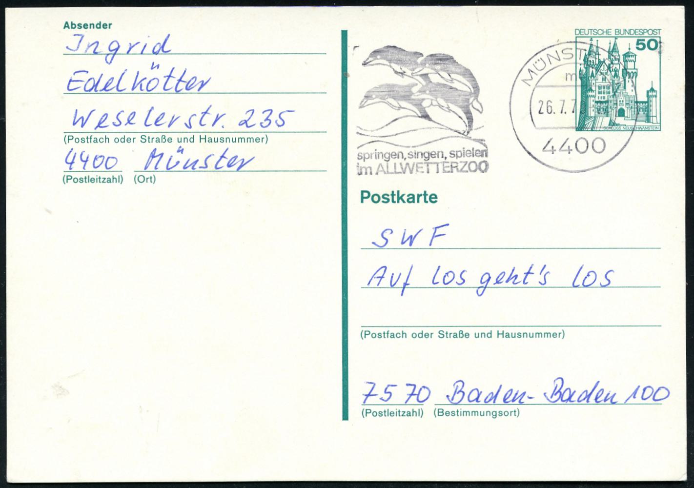 7639 | 10 € | 4400 Münster Maschinen- u. Serienstempel : 4400 MÜNSTER 1/ mc/ springen/ ..spielen/ im/ ALLWETTERZOO 1979 MWSt = Delphin (springt durch Ring) Bedarfs-Kt. (Bo.136 A III , n u r 1979-81 verwendet!) | ![]() | |