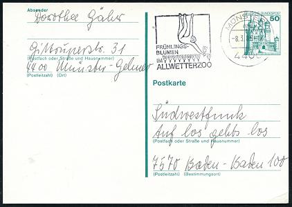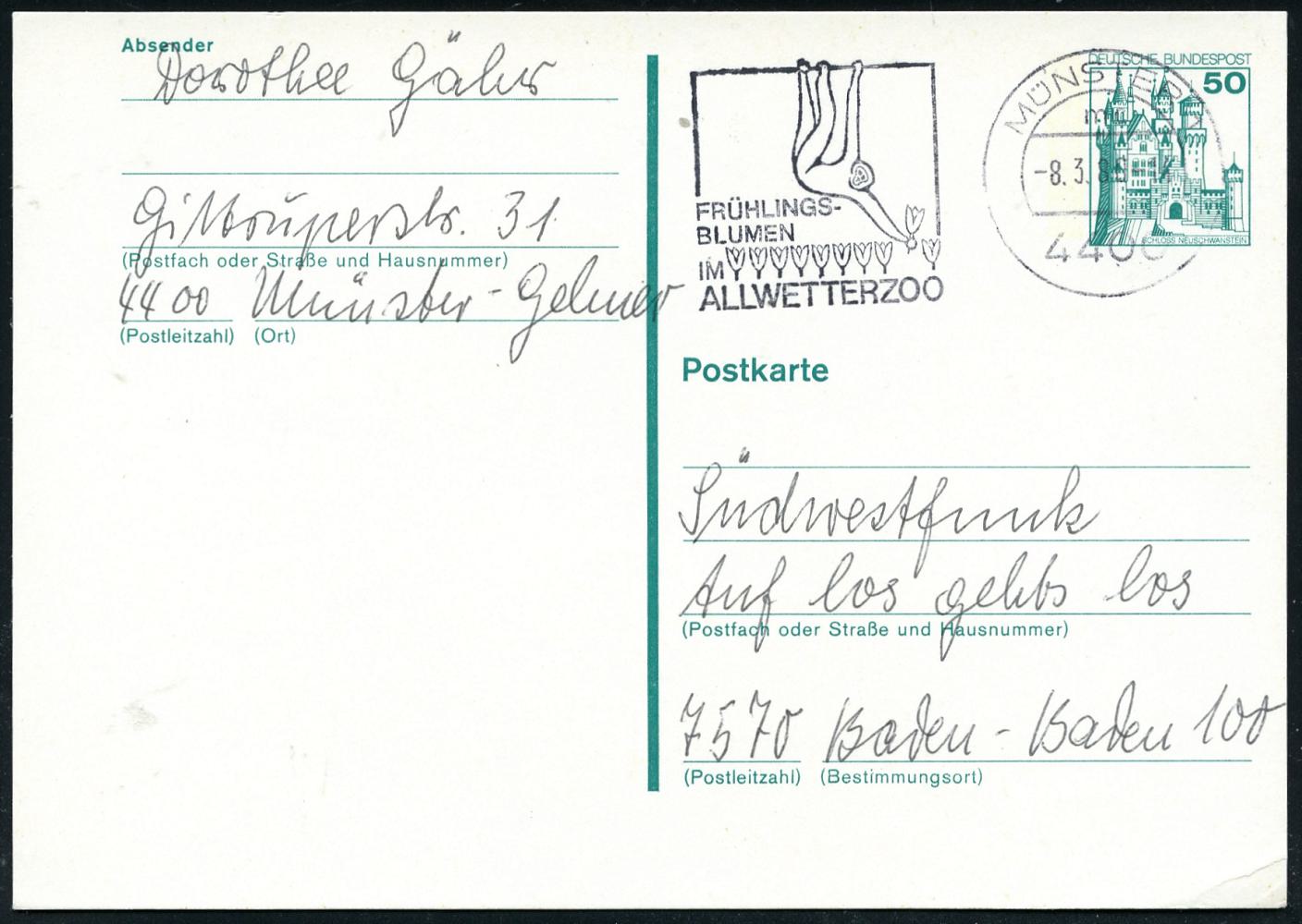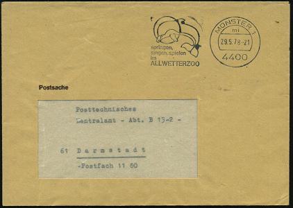 7642 | 8 € | 4400 Münster Maschinen- u. Serienstempel : 4400 MÜNSTER 1/ mc/ FRÜHLINGS-/ BLUMEN/ IM/ ALLWETTERZOO 1980 (8.3.) MWSt = Gibbon (u. Tulpen) klar gest. Bedarfs-Kt. (Bo.155 A) | ![]() | |
