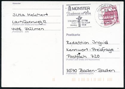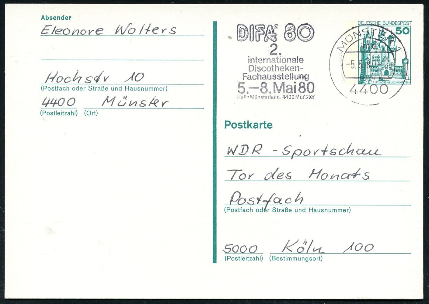 7643 | 6 € | 4400 Münster Maschinen- u. Serienstempel : 4400 MÜNSTER 1/ md/ DIFA 80/ 2./ intern./ Discotheken-/ Fachausstellung/ 5.-8.Mai 1980 (Apr.) MWSt , Bedarfs-Kt. (Bo.157 A II) | ![]() | |