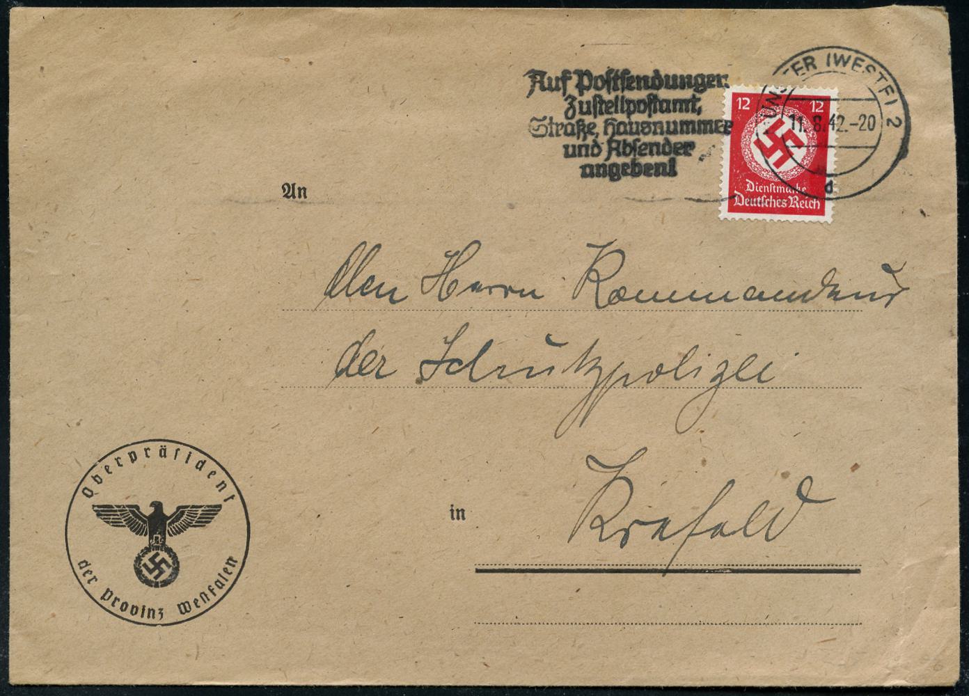 7620 | 16 € | 4400 Münster Maschinen- u. Serienstempel : MÜNSTER (WESTF) 2/ d/ Auf Postsendungen/ Zustellpostamt,/ Straße,Hausnummer/ u.Absender/ angeben! 1942 (11.8.) Serien-MWSt auf EF 12 Pf. Behördendienst , klar gest. Dienst-Bf.: Oberpräsident der Provinz Westfalen n. Krefeld (Bo.S 235 A, nur in 6 Orten verwendet) | ![]() | |