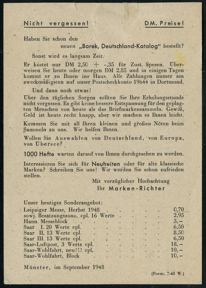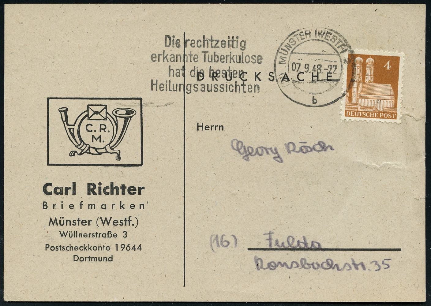 7626 | 15 € | 4400 Münster Maschinen- u. Serienstempel : MÜNSTER (WESTF) 2/ b/ Die rechtzeitig/ erkannte Tuberkulose/ hat die besten/ Heilungsaussichten 1948 (7.9.) Serien-MWSt auf Firmen-Kt.: Carl Richter, Briefmarken.. (kl. Seitenriß geschl.) n. Fulda (Bo.S 444 A, in nur 5 Orten verwendet!) | ![]() ![]() | |