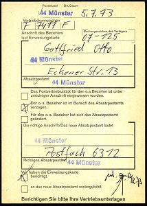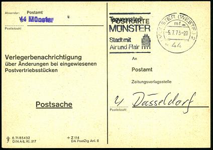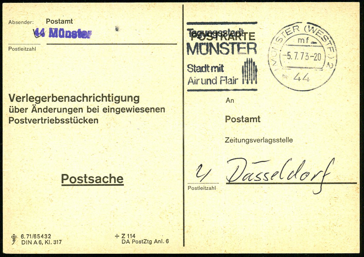 7632 | 14 € | 4400 Münster Maschinen- u. Serienstempel : 44 MÜNSTER (WESTF)2/ mf/ Tagungsstadt.. 1973 (5.7.) MWSt + amtl., viol. 1L: 44 Münster auf Postdienst-Kt.: Verlegerbenachrichtigung über Änderungen bei eingewiesenen Postvertriebsstücken (Zeitungssache) n. Düsseldorf | ![]() ![]() | |