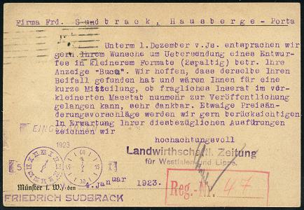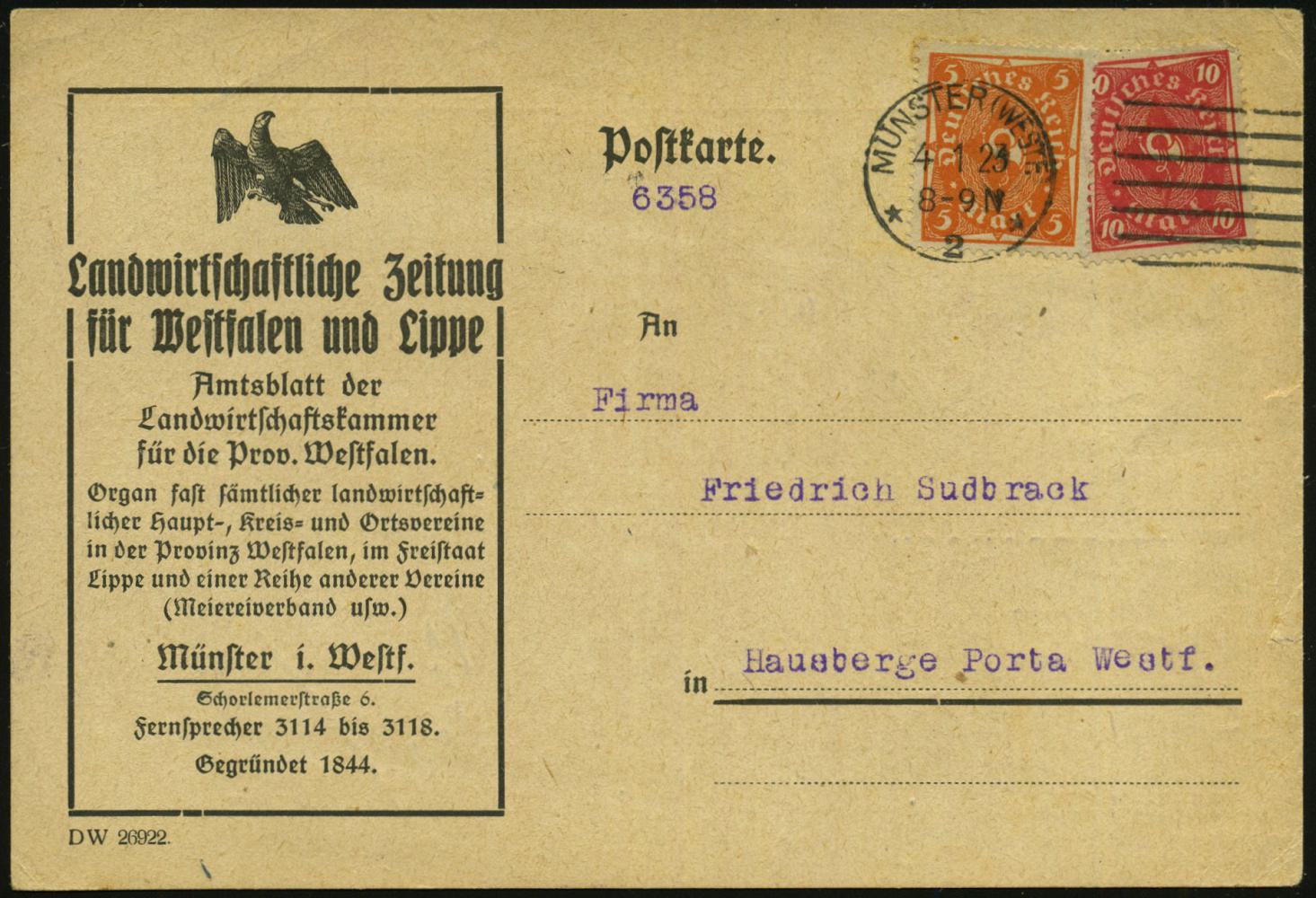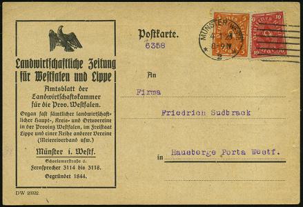 7609 | 16 € | 4400 Münster Maschinen- u. Serienstempel : MÜNSTER (WESTF.)/ *2* 1923 (4.1.) MaStrichSt. , dekorative Infla-Dienst-Kt.: Landwirtschaftl. Zeitung für Westfalen u. Lippe der Landwirtschaftskammer (Mi.194/95) | ![]() ![]() | |