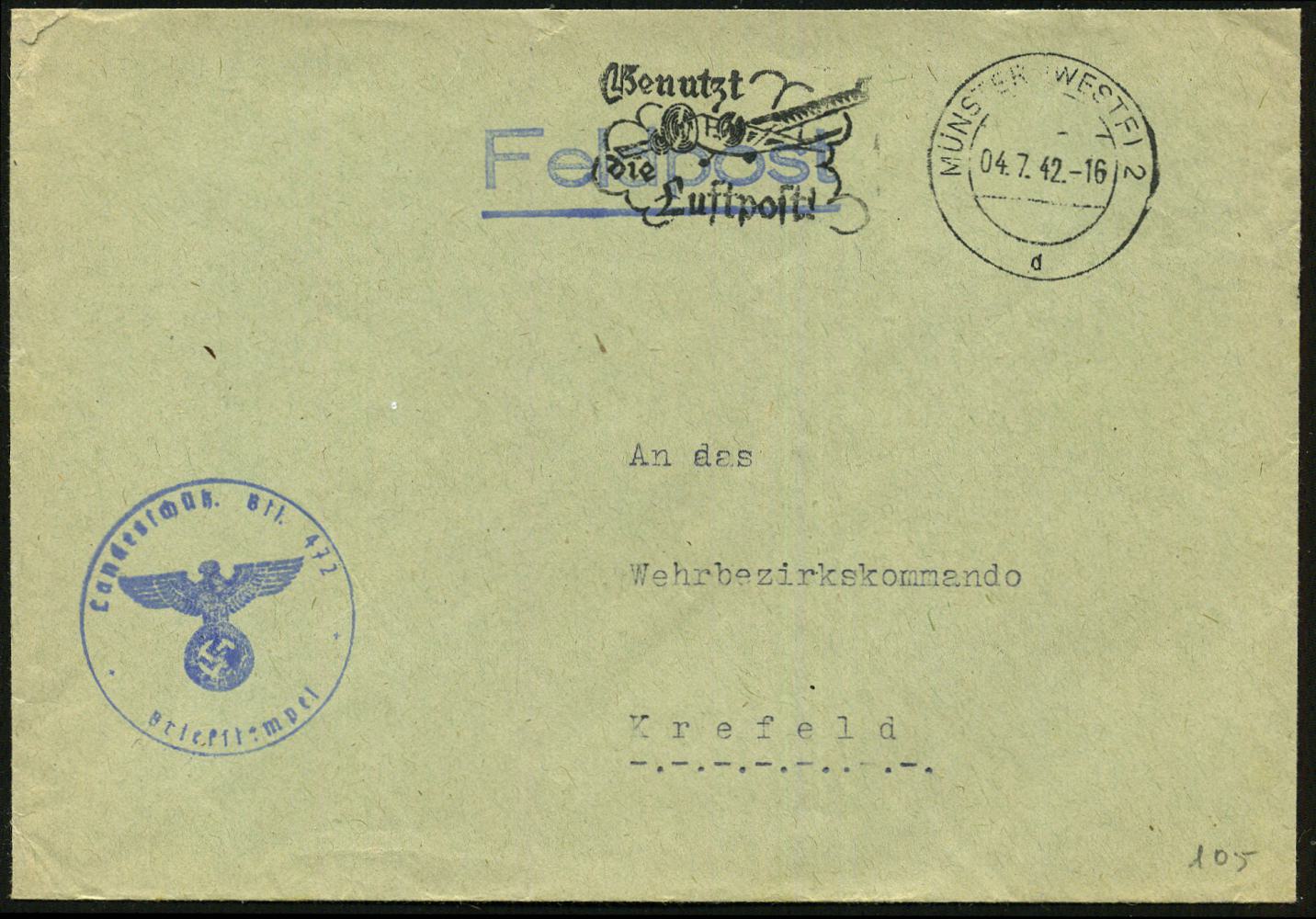7618 | 15 € | 4400 Münster Maschinen- u. Serienstempel : MÜNSTER (WESTF) 2/ b/ Benutzt/ die/ Luftpost! 1942 (20.5.) Serien-MWSt (3-mot. Flugz.) + viol. 1K-HdN: Heeresbetreuungsabt. 3.., klar gest.a. Feldpost-Bf. (Bo.S 105 A = Letztjahr!) | ![]() | |
