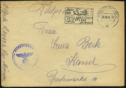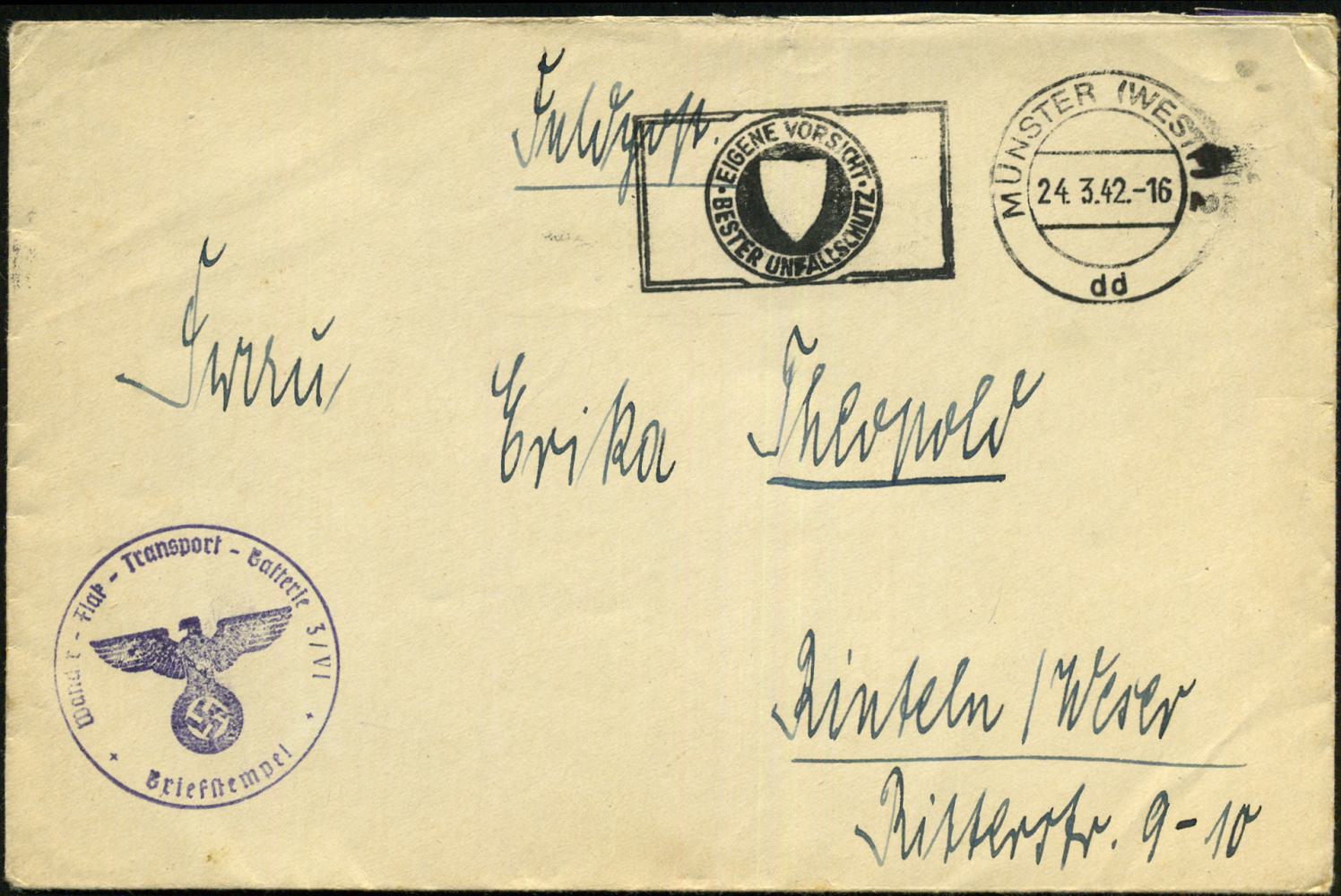 7619 | 20 € | 4400 Münster Maschinen- u. Serienstempel : MÜNSTER 2 1942/43 Serien-MWSt.: MÜNSTER (WESTF) 2/dd/EIGENE VORSICHT.. bzw. bb/Mehr/als/32 MILLIONEN/BRT/sind weg! (sinkender brit. Frachter) + viol. 1K-HdN: W a n d e r - F l a k - Transport-Batterie 3/VI bzw. Fp.-Nr. 22992 = Schwere Flak Transp. Battr. 128/VI, 2 Feldpost-Briefe (je rs. Öffnungsmäng.) mit Inhalt!, 2 Belege (Bo.S 268 A, S 403 A) | ![]() ![]() | |