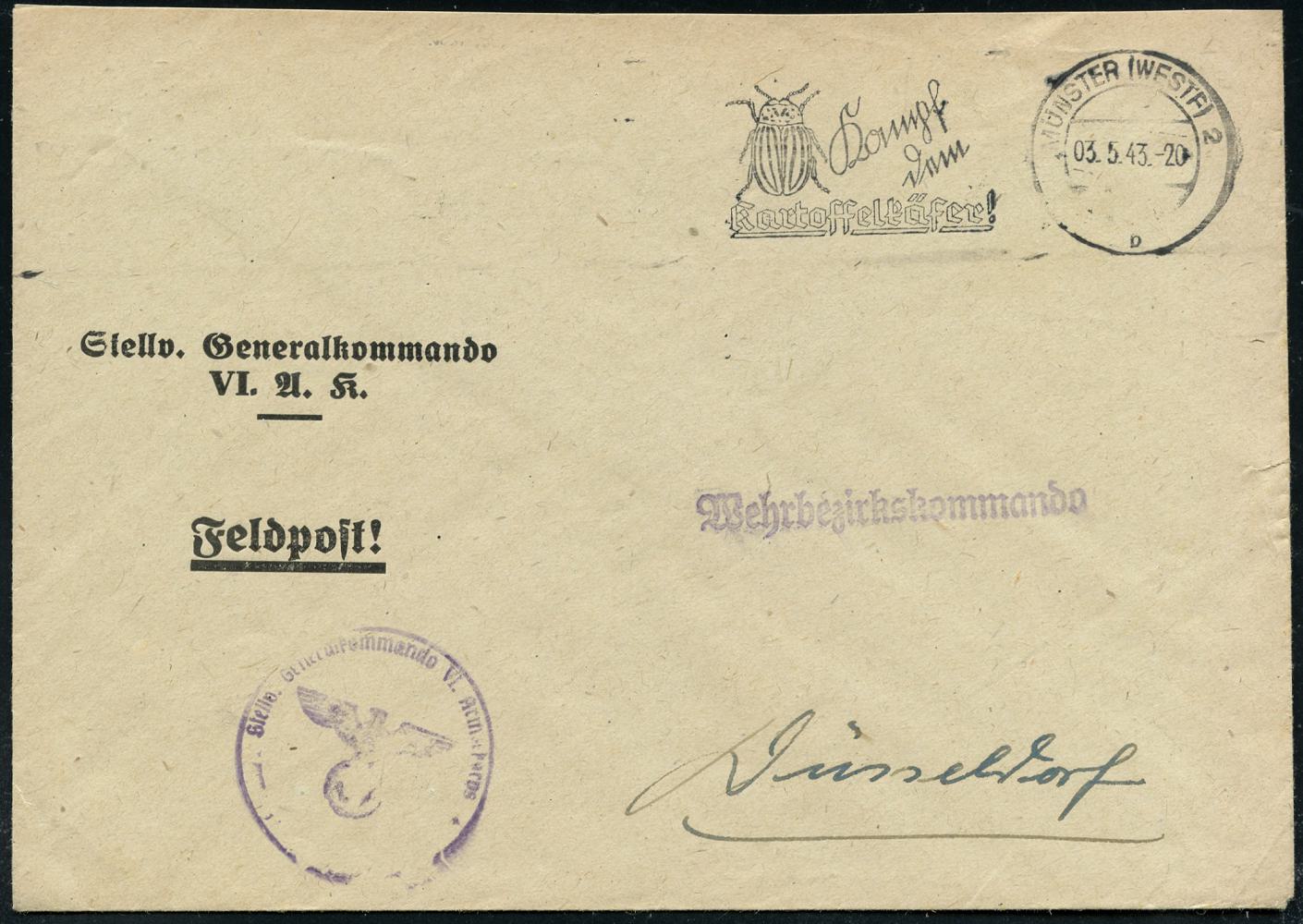 7622 | 18 € | 4400 Münster Maschinen- u. Serienstempel : MÜNSTER (WESTF) 2/ b/ Kampf/ dem/ Kartoffelkäfer! 1943 (3.5.) Serien-MWSt, teils Sütterlin = Kartoffelkäfer + viol. 1K-HdN: Stellv. Generalkommando VI. Armeekorps auf Feldpost-Vordruck-Bf.: Stellv. Generalkommando VI. A.K. (Bo.S 361 A) | ![]() | |