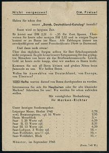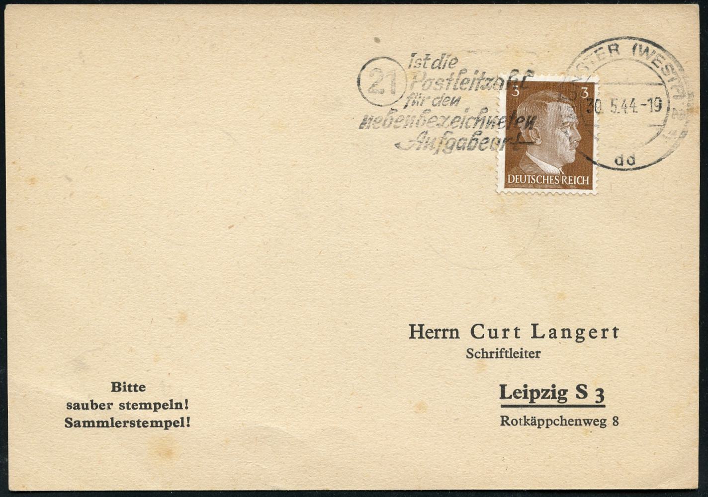 7624 | 18 € | 4400 Münster Maschinen- u. Serienstempel : MÜNSTER (WESTF) 2/ dd/ (21) ist die/ Postleitzahl.. 1944 (30.5.) seltener Serien-MWSt klar auf Inl.-Drs.-Karte (Bo.S 417 A , UB "dd") | ![]() ![]() | |