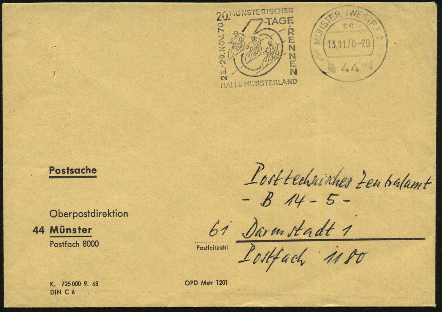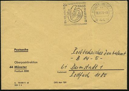 7630 | 12 € | 4400 Münster Maschinen- u. Serienstempel : 44 MÜNSTER (WESTF) 2/ cc/ 20.MÜNSTERR./ 6-TAGE/ RENNEN 1970 (13.11.) MWSt = 3 Rad-Bahnfahrer auf Ortsdruck-Postdienst-Bf.: OPD Münster.. (Bo.96 A) | ![]() | |