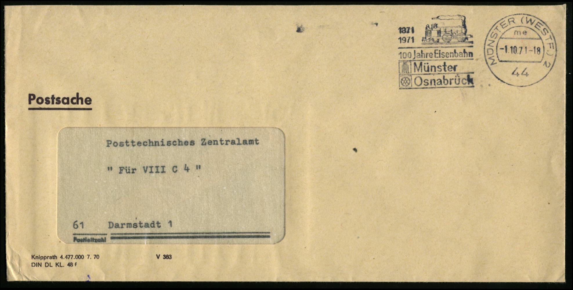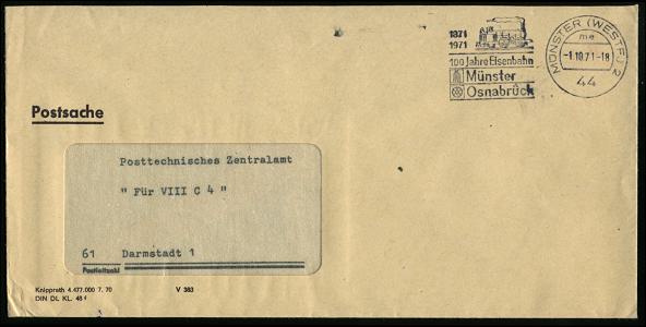 7633 | 14 € | 4400 Münster Maschinen- u. Serienstempel : 44 MÜNSTER (WESTF.) 2/ me/ 100 Jahre Eisenbahn/ Münster/ Osnabrück 1971 (1.10.) MWSt (histor. Dampflok) Postdienst-Bf. | ![]() | |