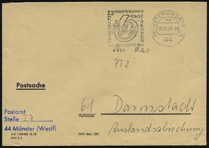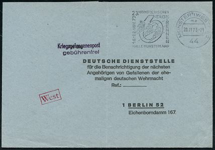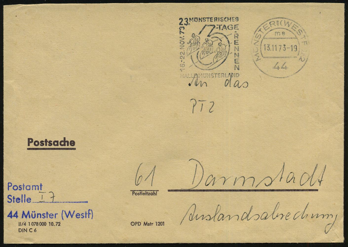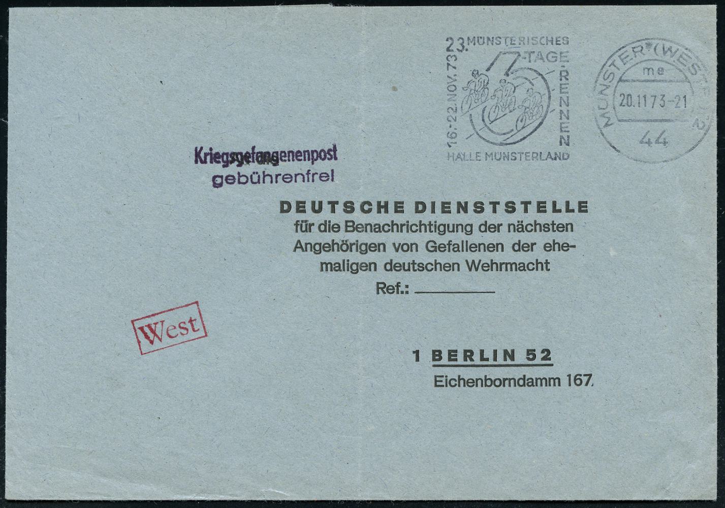 7635 | 18 € | 4400 Münster Maschinen- u. Serienstempel : 44 MÜNSTER(WESTF)2/ me/ 23.MÜNSTERR./ 6-TAGE/ RENNEN 1973 (20.11.) MWSt = 3 Rad-Bahnfahrer + schw. 2L: Kriegsgefangenenpost/ gebührenfrei auf Antwort-Dienst-Bf.: DEUTSCHE DIENSTSTELLE.. von Gefallenen der ehem. deutschen Wehrmacht (WASt) n. West-Berlin!, seltene Verwendung! (Bo.116 A) | ![]() | |