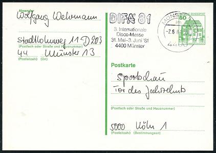 7644 | 8 € | 4400 Münster Maschinen- u. Serienstempel : 4400 MÜNSTER 1/ im/ DIFA´81/ 3.Internat./ Disco-Messe 1981 (7.6.) MWSt klar auf Bedarfs-Kt. (Bo.161 A) | ![]() | |