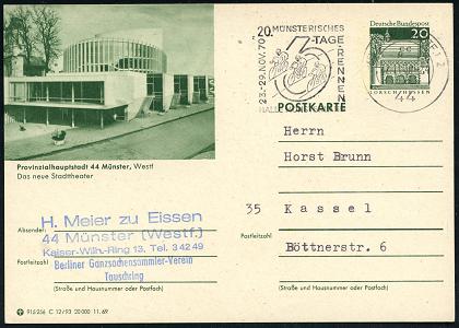 7631 | 18 € | 4400 Münster Maschinen- u. Serienstempel : 44 MÜNSTER (WESTF) 2/ cc/ 20.MÜNSTERR./ 6-TAGE/ RENNEN 1970 (22.11.) MWSt = 3 Rad-Bahnfahrer auf Ortsgleicher BiP 20 Pf. Lorsch, grün: 44 Münster.. neues Stadttheater vom philat. Autor H. Meiser zu Eissen, Bedarf mit viel Text u. orig. Signatur!, seltene Kombination (Bo.96 A) | ![]() | |