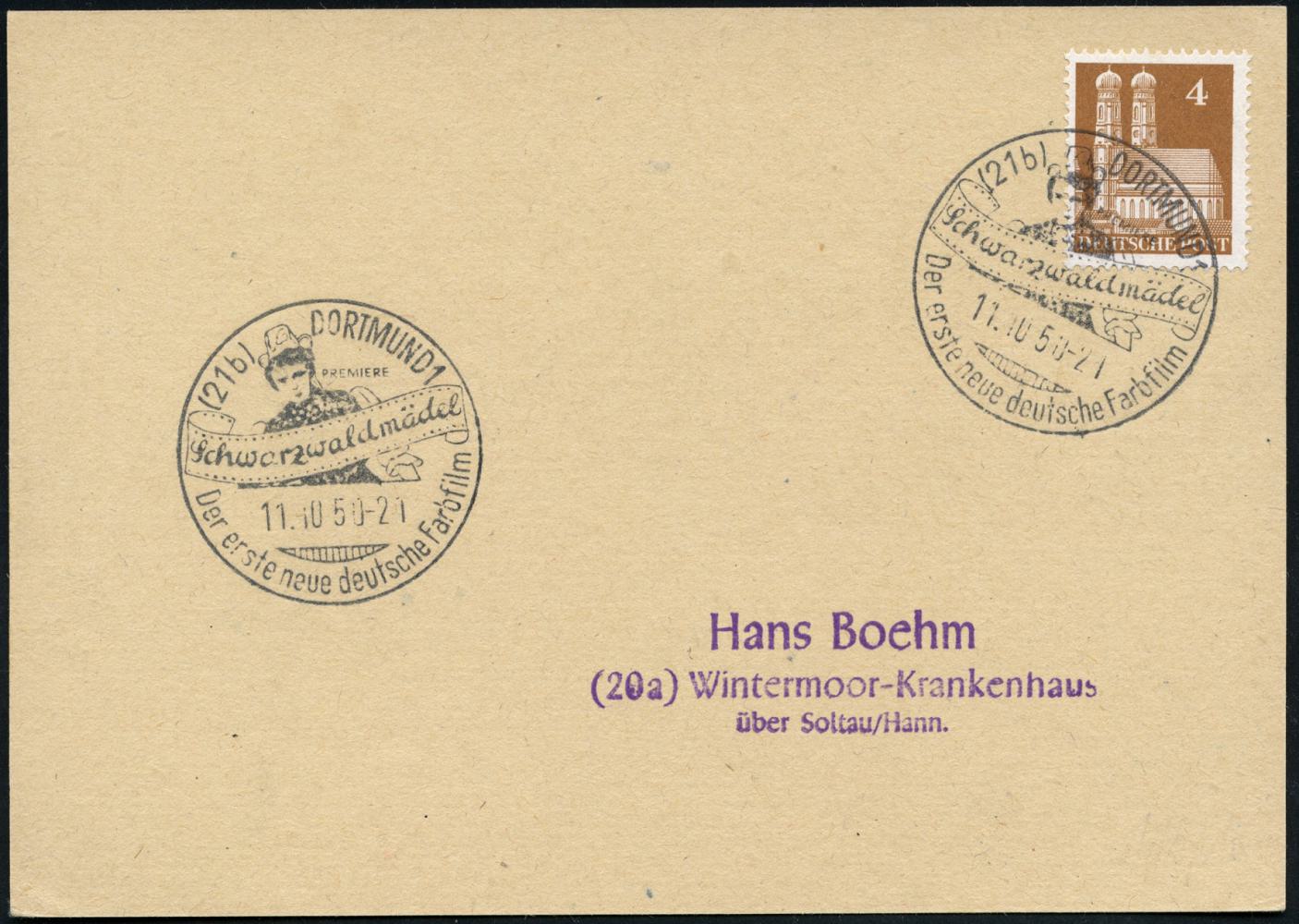 7953 | 18 € | 4600 Dortmund Sonderstempel : (21b) DORTMUND 1/ PREMIERE/ Schwarzwaldmädel/ Der erste neue deutsche Farbfilm 1950 (11.10.) SSt (Frau in Tracht, Filmband) klar auf Inl.-Drs.-Karte (Bo.15) | ![]() | |