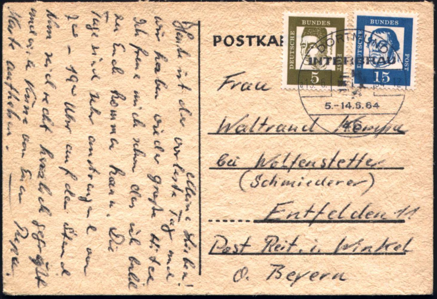 7957 | 20 € | 4600 Dortmund Sonderstempel : 46 DORTMUND/ INTERBRAU/ a 1964 (13.6.) SSt auf frankiertem B i e d e c k e l "INTERBRAU" (von der Ausstellung!) Bedarfs-Kt. mit viel Text, seltene Verwendung! (Bo.58 a) | ![]() ![]() | |