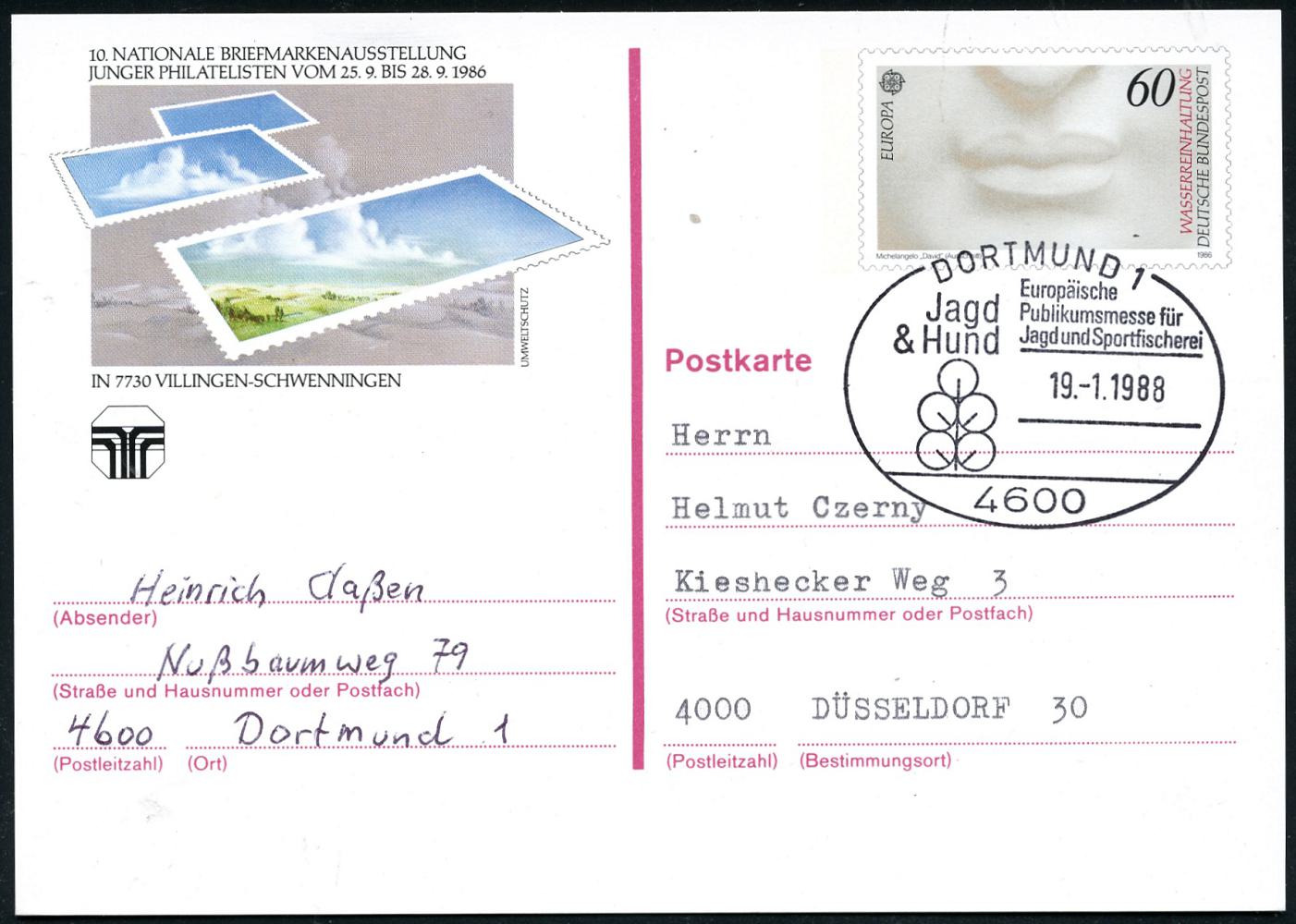 7965 | 8 € | 4600 Dortmund Sonderstempel : 4600 DORTMUND 1/ Jagd/ & Hund/ Europ./ Publikumsmesse f./ Jagd u.Sportfischerei 1988 (19.1.) SSt (Logo) klar gest. Inl.-Karte | ![]() | |