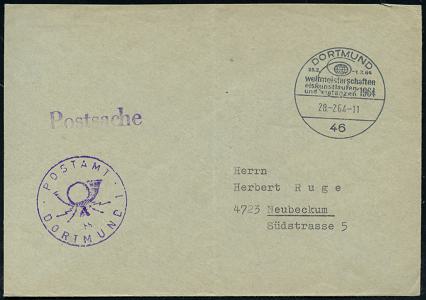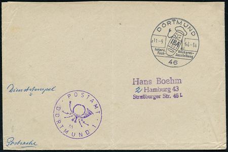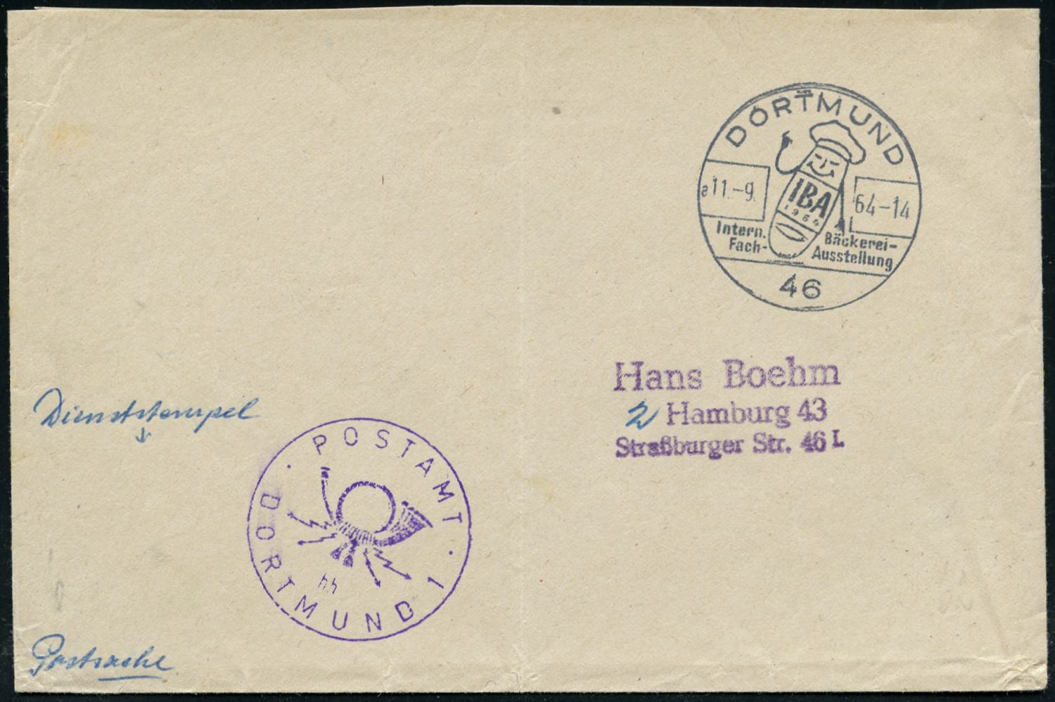 7958 | 12 € | 4600 Dortmund Sonderstempel : 46 DORTMUND/ a/ IBA/ Intern.Bäckerei-/ Fach-Ausstellung 1964 (11.9.) SSt = Bäcker als Brot + viol. 1K-HdN.: POSTAMT/hh/DORTMUND 1 (Posthorn) auf (gefaltetem) Postdienst-Antwort-Bf. (Bo.62 a) | ![]() | |