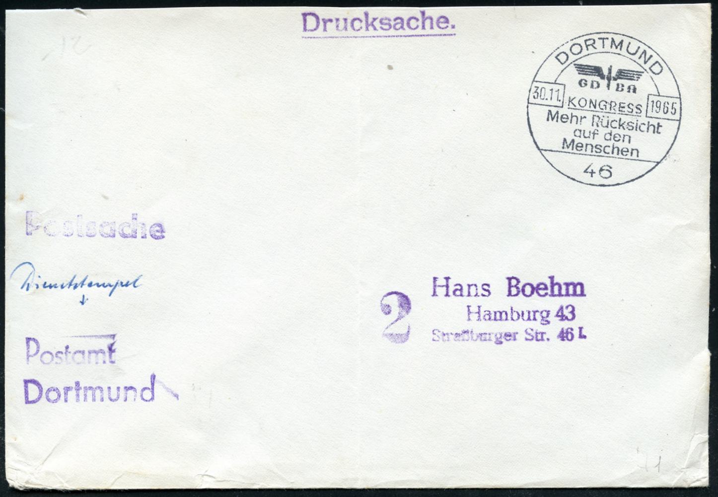 7960 | 12 € | 4600 Dortmund Sonderstempel : 46 DORTMUND/ GDBA/ KONGRESS/ Mehr Rücksicht/ auf den/ Menschen 1965 (30.11.) SSt (geflügeltes Rad = Gewerkschaftskongreß) + 2L: Postamt/ Dortmund + 1L: Postsache (Bf. Mittelfalte, da) Postdienst-Antwort-Bf. (Bo.71) | ![]() | |