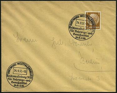 7951 | 20 € | 4600 Dortmund Sonderstempel : DORTMUND W E S T F A L E N H A L L E / Reichsausstellung/ für Nahrungs-u./ Genußmittel 1937 (24.9.) SSt = Saison-Postamt Westfalenhalle , klar gest. Inl.-Bf. (Bo.8) | ![]() | |