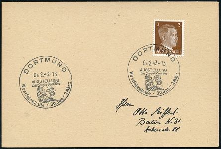 7952 | 1 € | 4600 Dortmund Sonderstempel : DORTMUND/ AUSSTELLUNG/ Das Sowjet-Paradies/ Westfalenhalle.. 1943 (Feb.) SSt = sowjet. Proletarierpaar mit Hungerkind , klar gest. Inl.-Karte (Bo.12) | ![]() | |