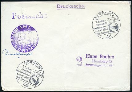 7959 | 14 € | 4600 Dortmund Sonderstempel : 46 DORTMUND/ 3.hallen-/ handball/ wm 1965/ der frauen 1965 (13.11.) SSt (Hand-Symbol) 2x klar + viol. Negativ-Siegel-HdN: POSTAMT/DORTMUND (gering undeutl.) Postdienst-Antwortbf. (daher Mittelfalte) klar gest.! (Bo.70) | ![]() | |