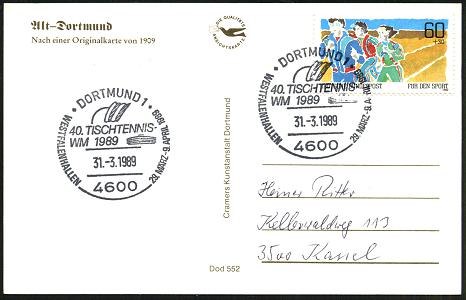 7961 | 14 € | 4600 Dortmund Sonderstempel : 4600 DORTMUND 1/ 40.TISCHTENNIS/ WM/ WESTFALENHALLE 1989 (31.3.) SSt (Westfalenhalle, Logo), klar gest. Inl.-Ak.: GRUSS AUS DER BIERSTADT DORTMUND | ![]() ![]() | |
