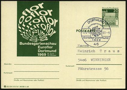 7962 | 14 € | 4600 Dortmund Sonderstempel : 46 DORTMUND/ Bundesgartenschau/ c/ Euroflor.. 1969 (25.4.) SSt (Blüte aus Buchstaben) auf motivgl. BiP 20 Pf. Lorsch, grün: Bundesgartenschau Euroflor..1969 (Mi.P 96) Inl.-Karte, seltene Kombination! (Bo.98 c) | ![]() | |