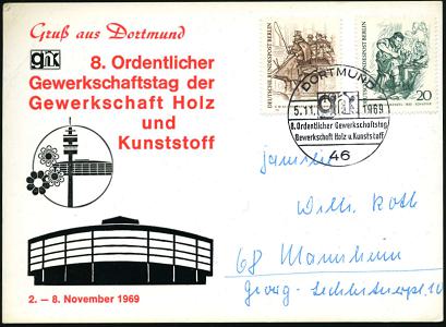 7963 | 16 € | 4600 Dortmund Sonderstempel : 46 DORTMUND/ ghk/ 8.Ordentl.Gewerkschaftstag/ Gewerkschaft Holz u.Kunststoff 1969 (5.11.) SSt (Monogr.-Logo) auf passender, zweifarbiger Sonderkarte: Westfalenhalle, Bedarf! (Bo.108) | ![]() | |