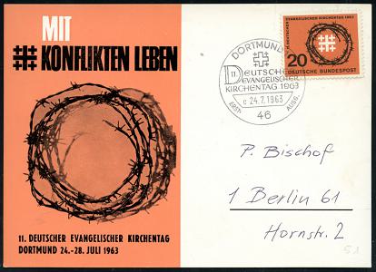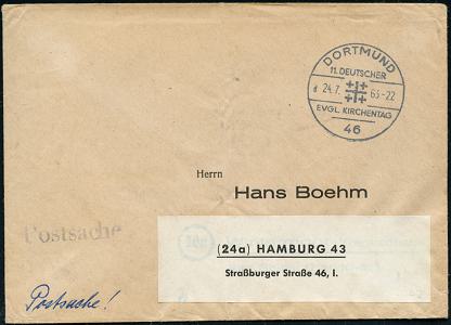 7955 | 12 € | 4600 Dortmund Sonderstempel : 46 DORTMUND/ d/ 11.deutscher7evgl.KIRCHENTAG 1963 (24.7.) SSt = Jerusalem-Kreuz + 1L: Postsache auf Postdienst-Antwort-Bf. (daher gefaltet) klar gest.! (Bo.52 d) | ![]() | |