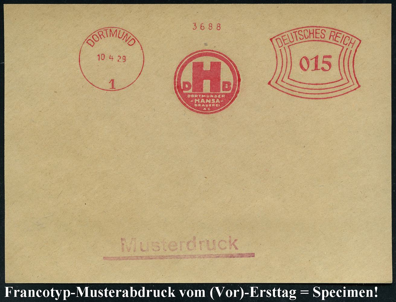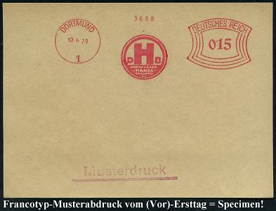 7996 | 35 € | 4600 Dortmund Absender-Freistempel : DORTMUND/ 1/ D H D/ DORTMUNDER/ HANSA/ BRAUEREI/ AG 1929 (10.4.) AFS-Musterabdruck "Bogenrechteck" (Monogr.-Logo) glasklar gest. Francotyp-Musterblatt vom (Vor)-Ersttag !, selten! (Dü.E-1CAh = frühe C-Maschine!) | ![]() ![]() | |