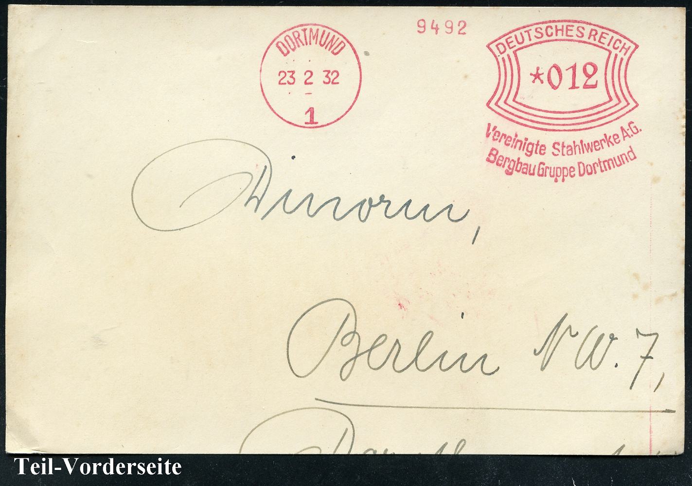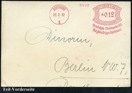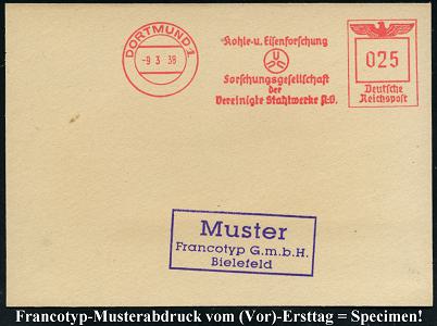 8027 | 35 € | 4600 Dortmund Absender-Freistempel : DORTMUND 1/ Kohle-u.Eisenforschung/ Forschungsgesellschaft/ d./ Vereinigten Stahlwerke AG. 1938 (9.3.) AFS-Musterabdruck Francotyp "Reichsadler" (Logo) glasklar gest. Francotyp-Musterblatt vom (Vor)-Ersttag !, selten! (Dü.E-5CG) | ![]() ![]() | |