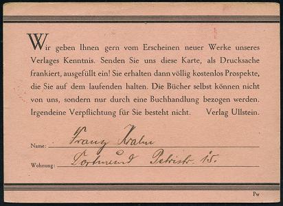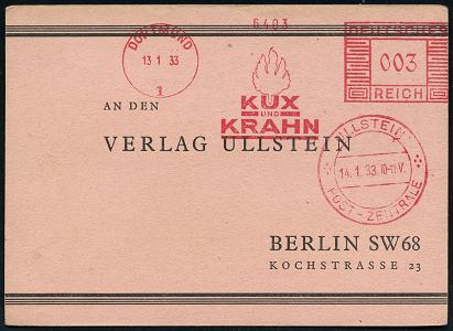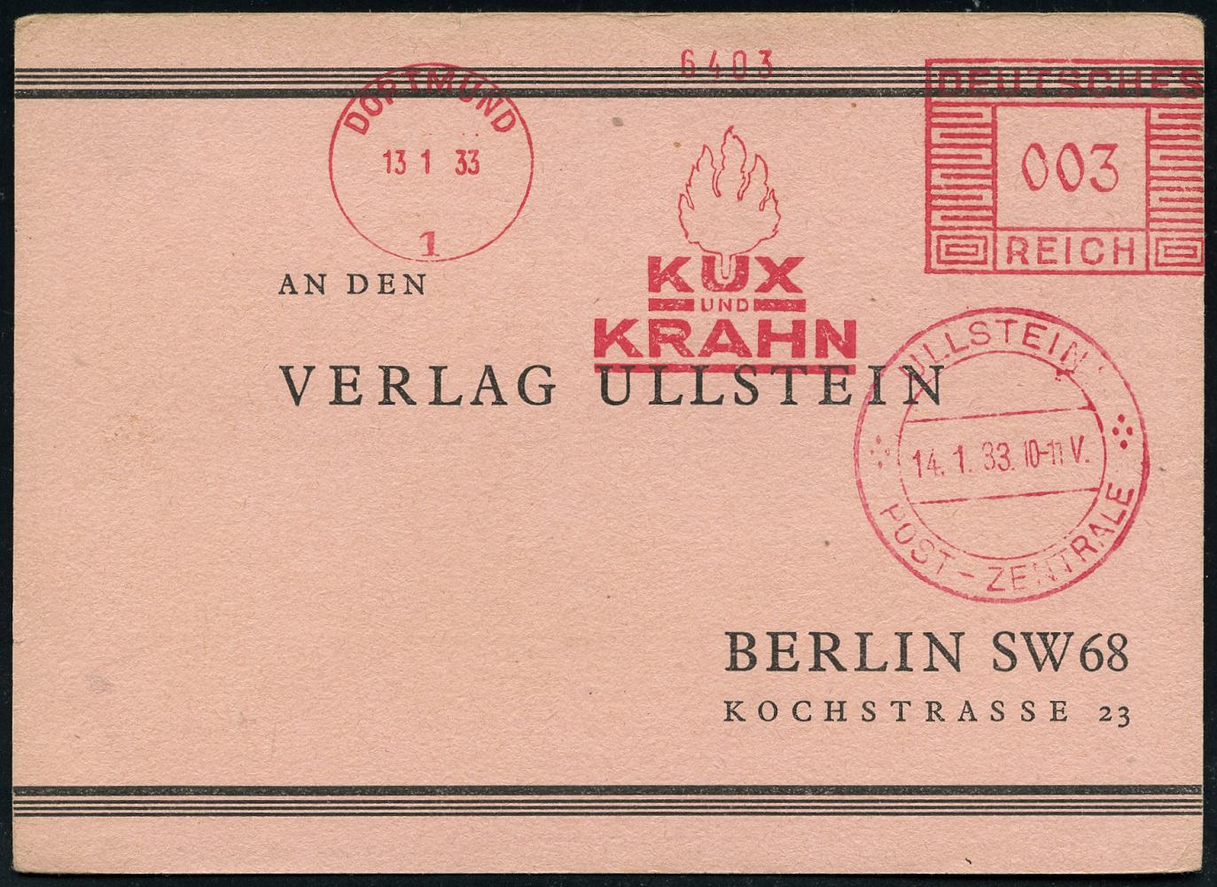 8001 | 28 € | 4600 Dortmund Absender-Freistempel : DORTMUND/ 1/ KUX/ UND/ KRAHN 1933 (13.1.) AFS Francotyp "Mäanderrechteck" (Flamme) Firmen-Antwort-Kt.: VERLAG ULLSTEIN, BERLIN SW 68 mit rotem Post-EingangsStpl.: ULLSTEIN/ POSTZENTRALE = jüdischer Verlag (von NS-Machthaben nach der Machtergreifung enteignet) = Zeitgeschichte! (Dü.E-2CEh) | ![]() ![]() | |